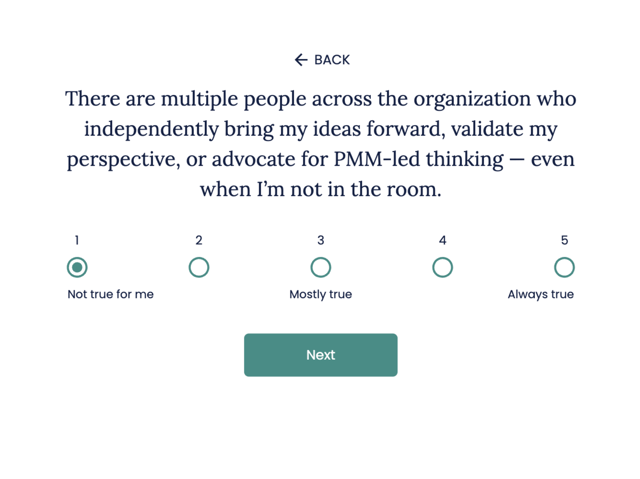 Most PMM leaders know they need to grow, but don't have a clear picture of where to focus. This assessment measures you across the five capabilities that define strong PMM leadership. Understand what good looks like, see where you are relative to it, and learn what to do next to grow.